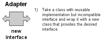 Adapter is about creating an intermediary abstraction that translates, or maps, the old component to the new system. Clients call methods on the Adapter object which redirects them into calls to the legacy component. This strategy can be implemented either with inheritance or with aggregation.