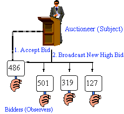 bidding, and "observes" when a paddle is raised to accept the bid. The