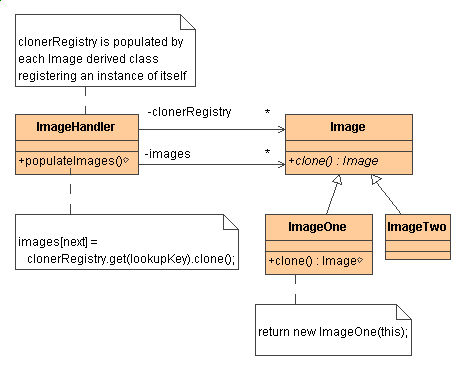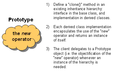 The client then, instead of writing code that invokes the "new" operator on a hard-wired class name, calls a "clone" operation on the abstract base class, supplying a string or enumerated data type that designates the particular concrete derived class desired.