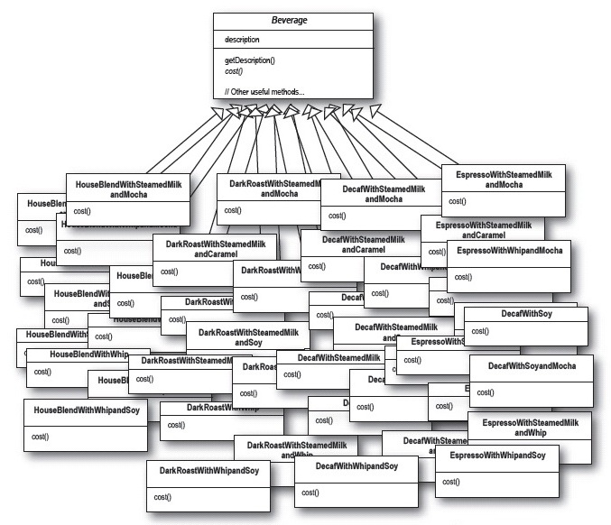 The Decorator pattern demonstrates how to support many permutations of core and optional features in software – all the features are mapped to classes that each implement a common interface, and then the user can mix and match any set of features she desires. [Michael Duell, "Non-software examples of software design patterns"] |