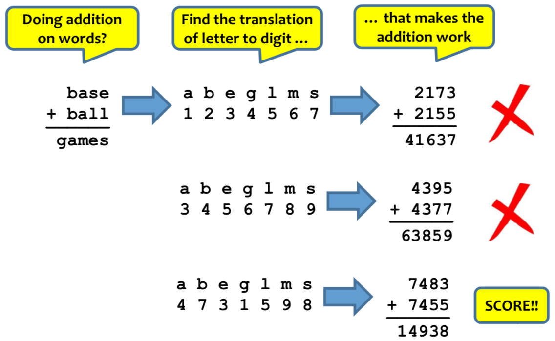 permutation's digits "into" the puzzle's equation to see if the addition is
