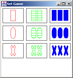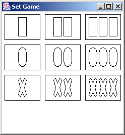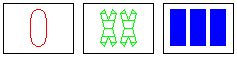 or O; and fill has: open, striped, or solid.Here are three cards that demonstrate all twelve values: