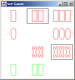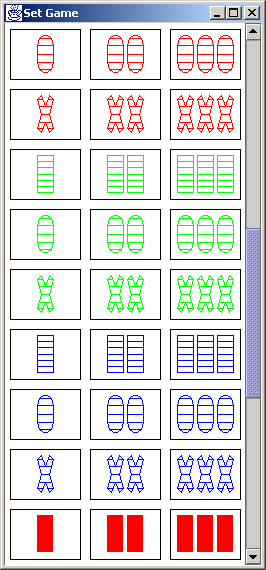 The problem at hand is: how to decide (or compute) whether any arbitrary combination of three Card objects (i.e. three entries from table 2) represent a set. One approach could be to loop through each of the three dimensions, and examine the corresponding digits for each dimension on all three Cards.