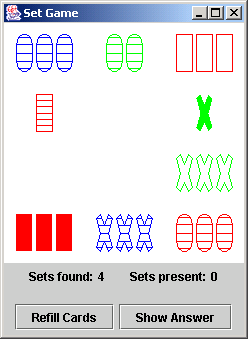 Twelve cards are initially displayed on the table. As players identify and pick up sets, the holes are filled by dealing replacement cards. The game is over when all the cards have been dealt, and no more sets can be formed. The maximum number of sets is 27. Because each individual card can participate in quite a few set, it is possible to find yourself at the end of the game with several cards that cannot be matched.